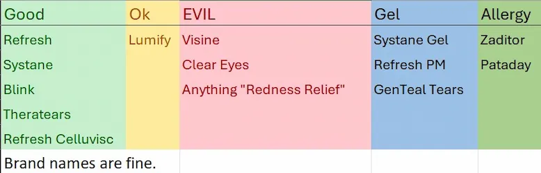 They go by the names of Visine, Clear Eyes, Rohto, or anything with “Redness Relief” on the packaging. Any variations are just the game garbage with different marketing.