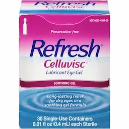 For some longer relief, try Refresh Celluvisc, which is preservative free. It is a gel that sticks around for longer than drops, providing that sweet moisturization to the eyes. It may cause some blurryness for the first few minutes.